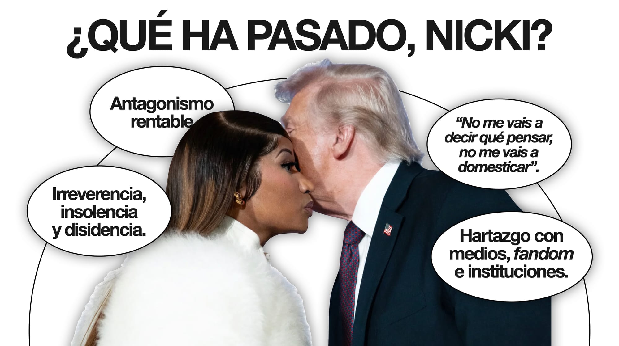 ¿Cómo ha acabado Nicki soltando mensajes antivacunas, abrazando una retórica anti-trans o dando gas a discursos y/o políticas antiinmigración? No se trata de una conversión doctrinal clásica, esto no va (únicamente) de "necesitar orden" o de ponerle ojitos al "conservadurismo moral". Minaj es vista por MAGA como un sinónimo útil del propio Trump: una artista que se ha sentido hostigada por quienes supuestamente debían defenderla, expresando su apetito por el conflicto y una radical negativa a dejarse disciplinar (explícitamente: "no me vais a decir a quién apoyar").