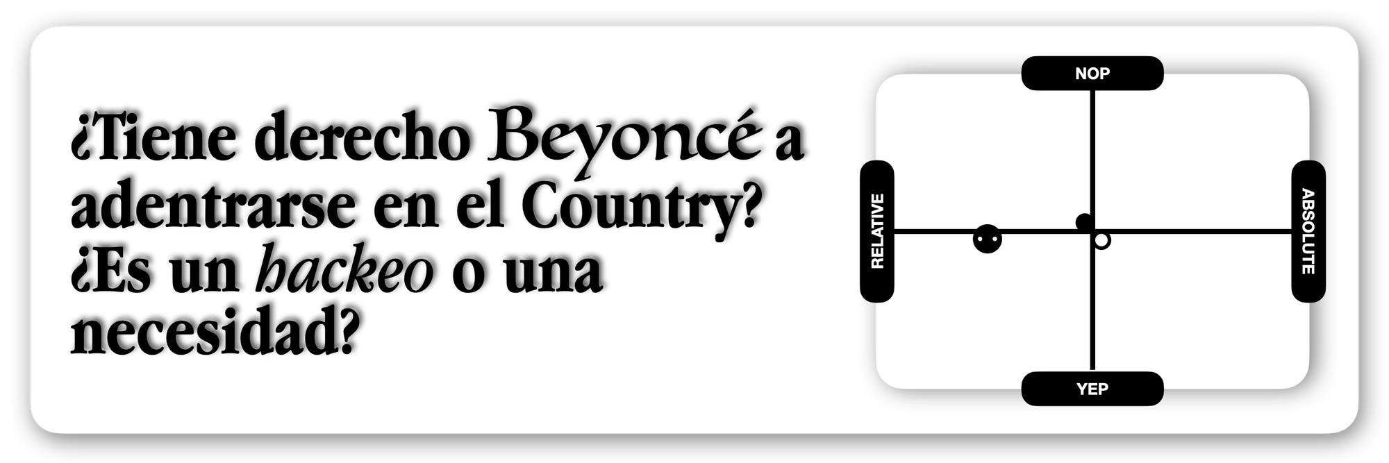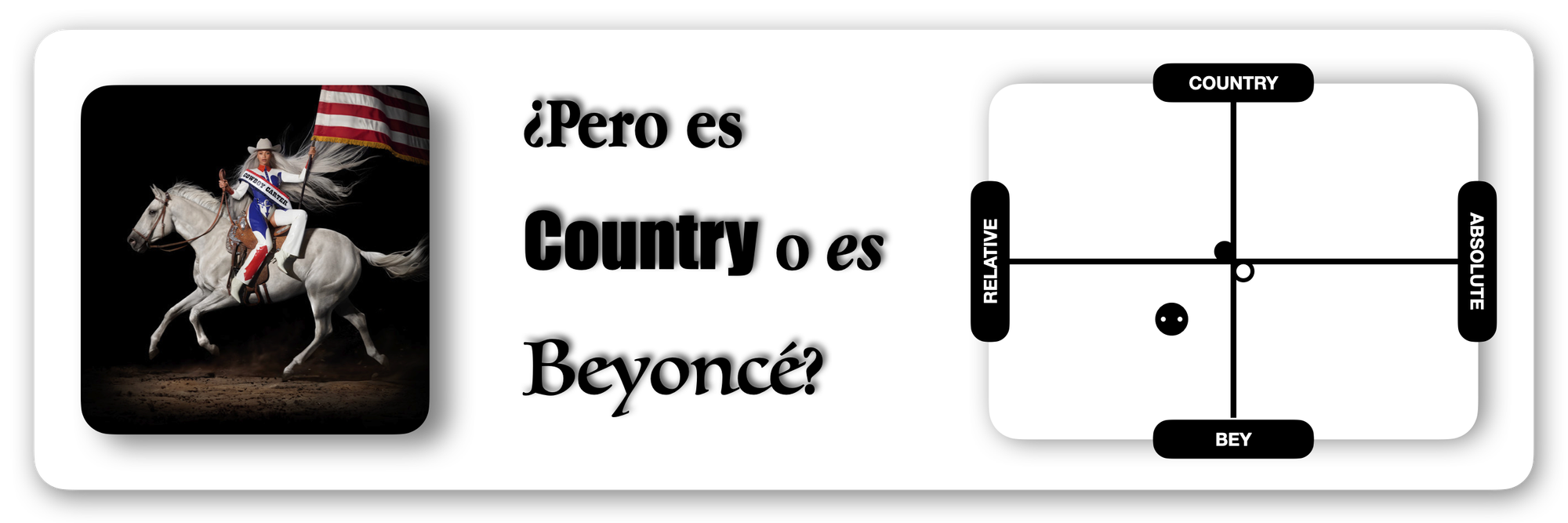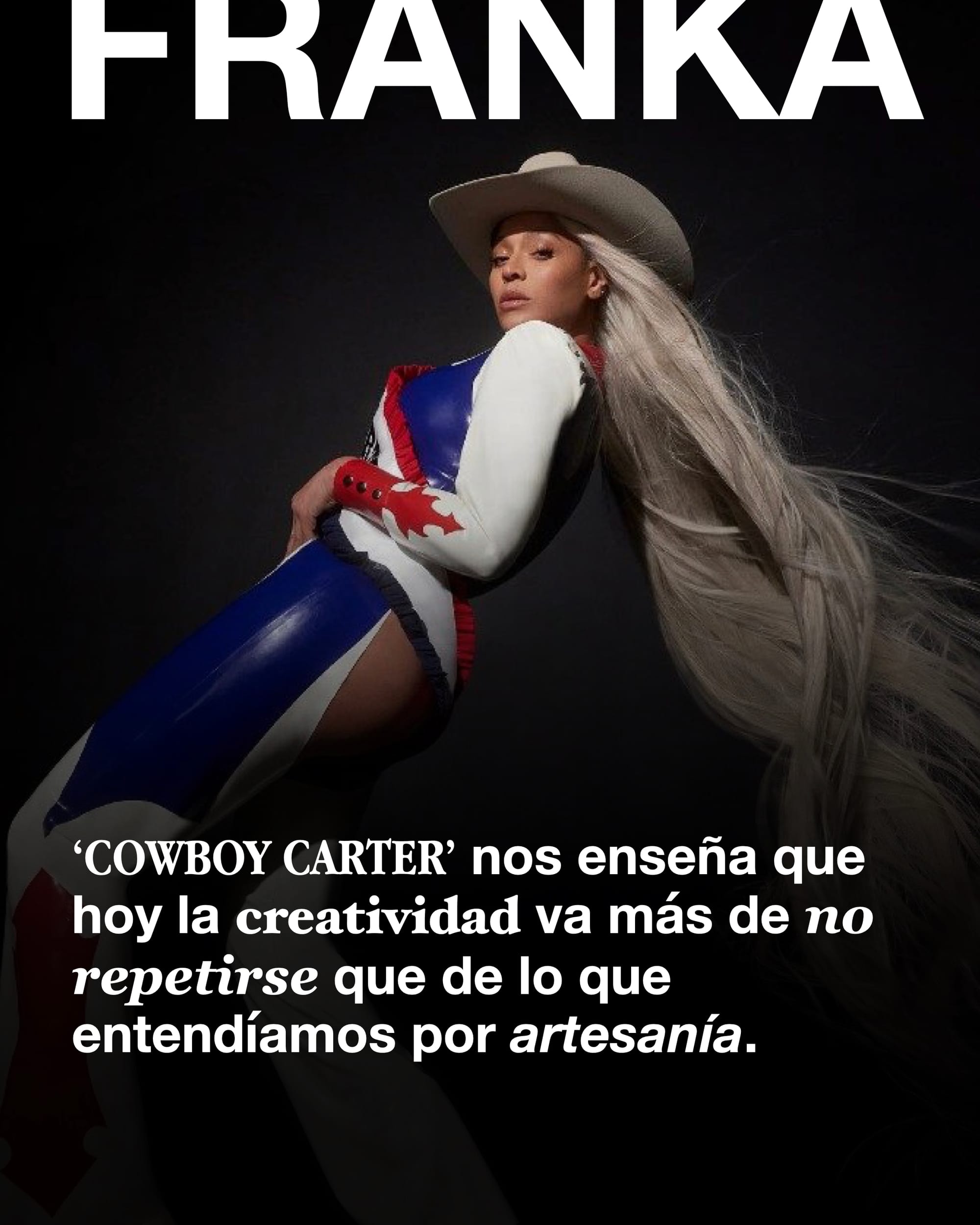 El riesgo sería decidir, al modo Joaquin Phoenix, que a partir de ahora te centrarás solo en el Country. “Ahora los memes que más y mejor se mueven son los de Country”, y Beyoncé se pone y pone a su equipo a trabajar en ello, utilizando sus capacidades y su auto-conocimiento de sí misma (y su audiencia) para identificar y captar todo aquello del Country que puede modularse para llevarlo a su terreno estético y sonoro.