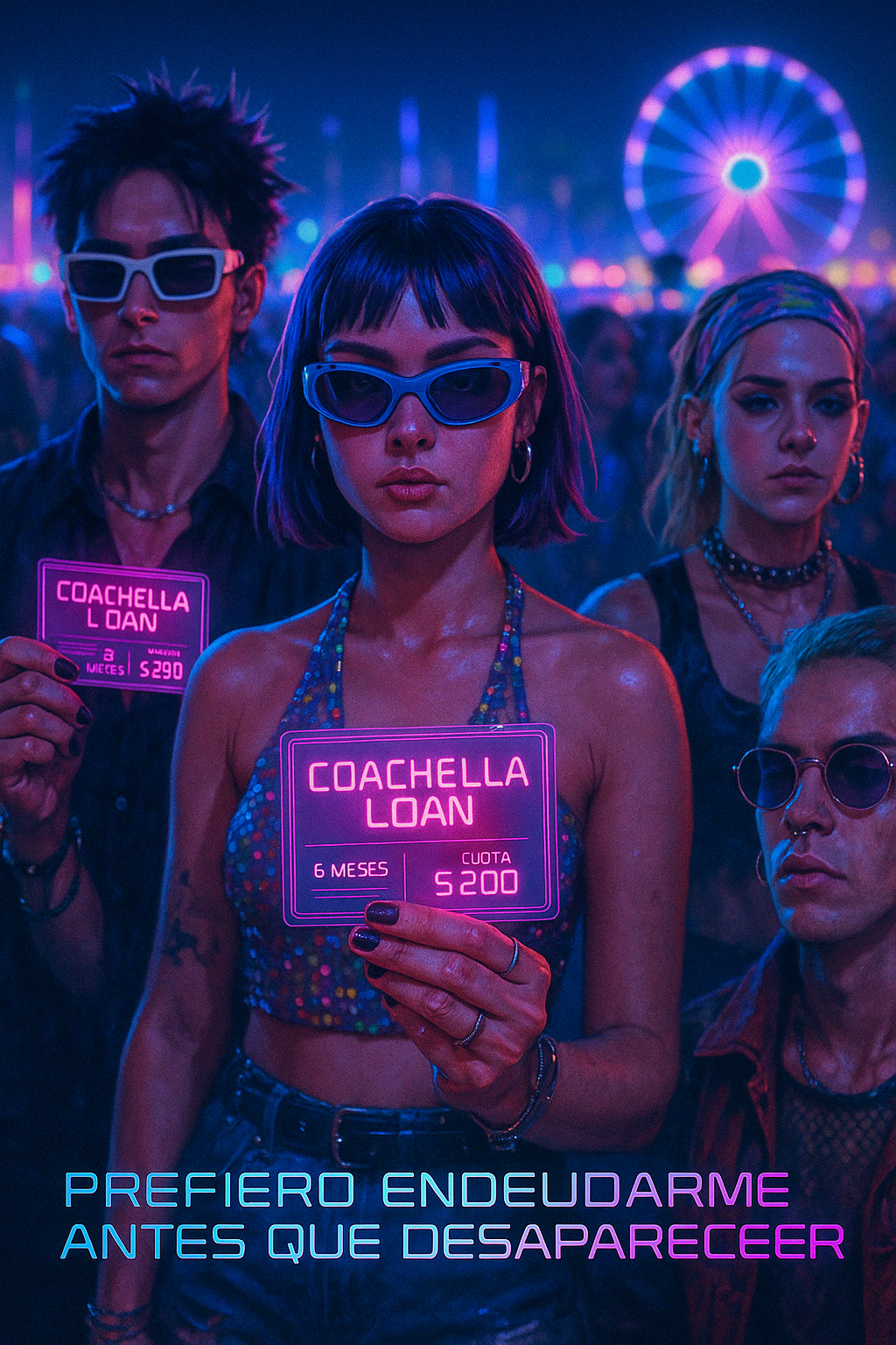 Durante los dos fines de semana del Coachella 2025, una cifra comenzó a circular con un leve impacto mediático (menos del esperado para una revelación así): el 60% de los asistentes jóvenes habían financiado su entrada a plazos. El dato pasó como pasan ya casi todas las señales del colapso: envuelto en diseño, integrado en la experiencia, asumido con un escándalo controlado. Bastan 49 dólares para reservar tu sitio en el simulacro, y luego vienen los pagos, los recargos, las amenazas de cancelación en caso de impago. No hablamos de privilegios VIP. Hablamos de acceso general. De lo mínimo. Del simple derecho a estar allí.
