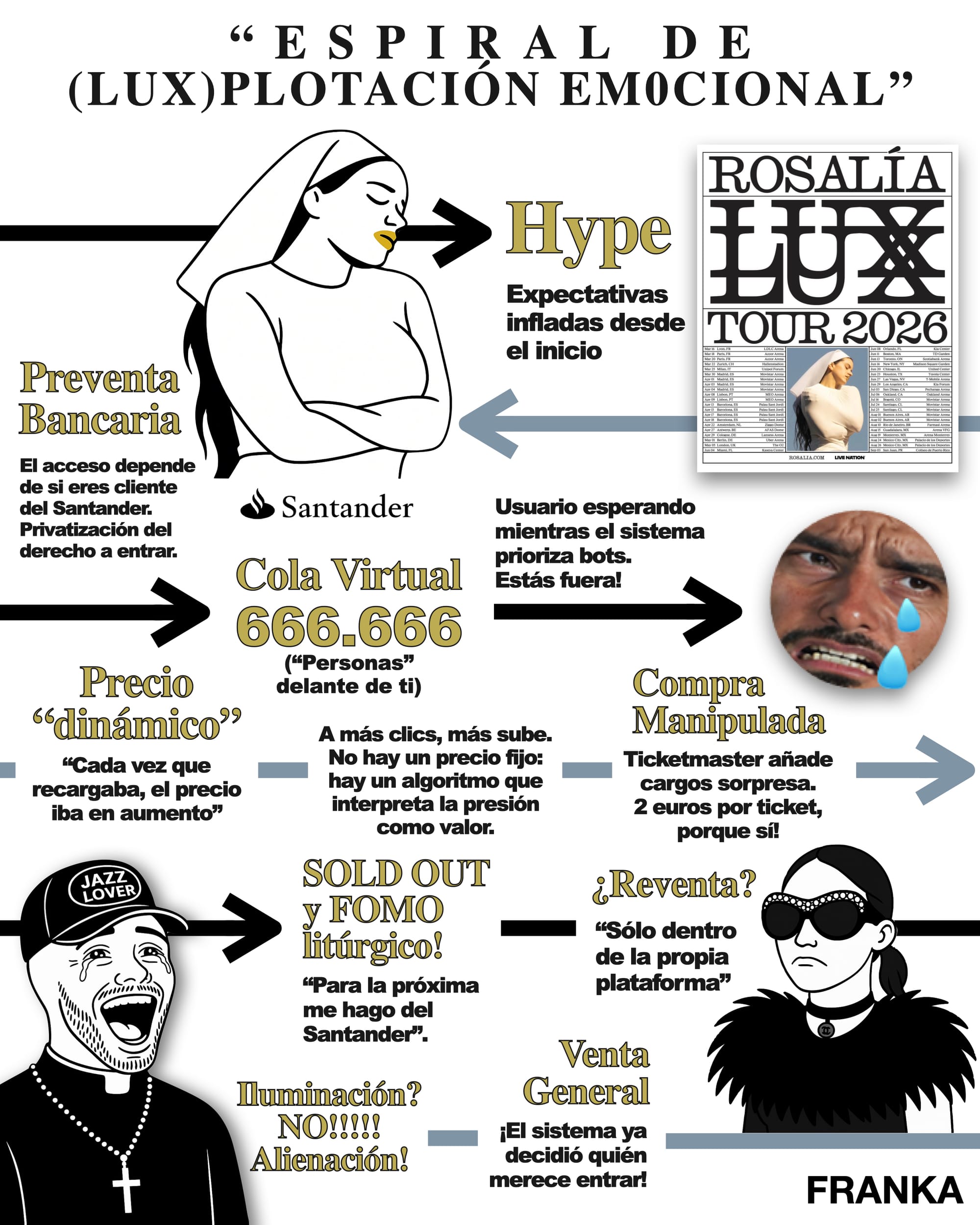 Efectivamente, nadie podía imaginar que tras el discurso "espiritual" que atraviesa 'LUX' y el cambio de skin de Rosalía, finalmente el acceso a sus ceremonias (véase conciertos) iba a estar privatizado y condicionado por privilegios financieros. Cuanto menos, paradójico: la retórica de la "trascendencia" que intenta transmitir la artista convive con una infraestructura que, en la práctica, filtra quién puede acercarse a la divina experiencia (según su relación con el Banco Santander). No se me ocurre una mejor campaña de afiliación para un banco. Y no se me ocurre una peor confirmación de lo que nos temíamos, en referencia a la artista catalana: más que un fallo de "coherencia", nos revela el lugar real donde ocurre su "espiritualidad": entre las aesthetics y el puro extractivismo.