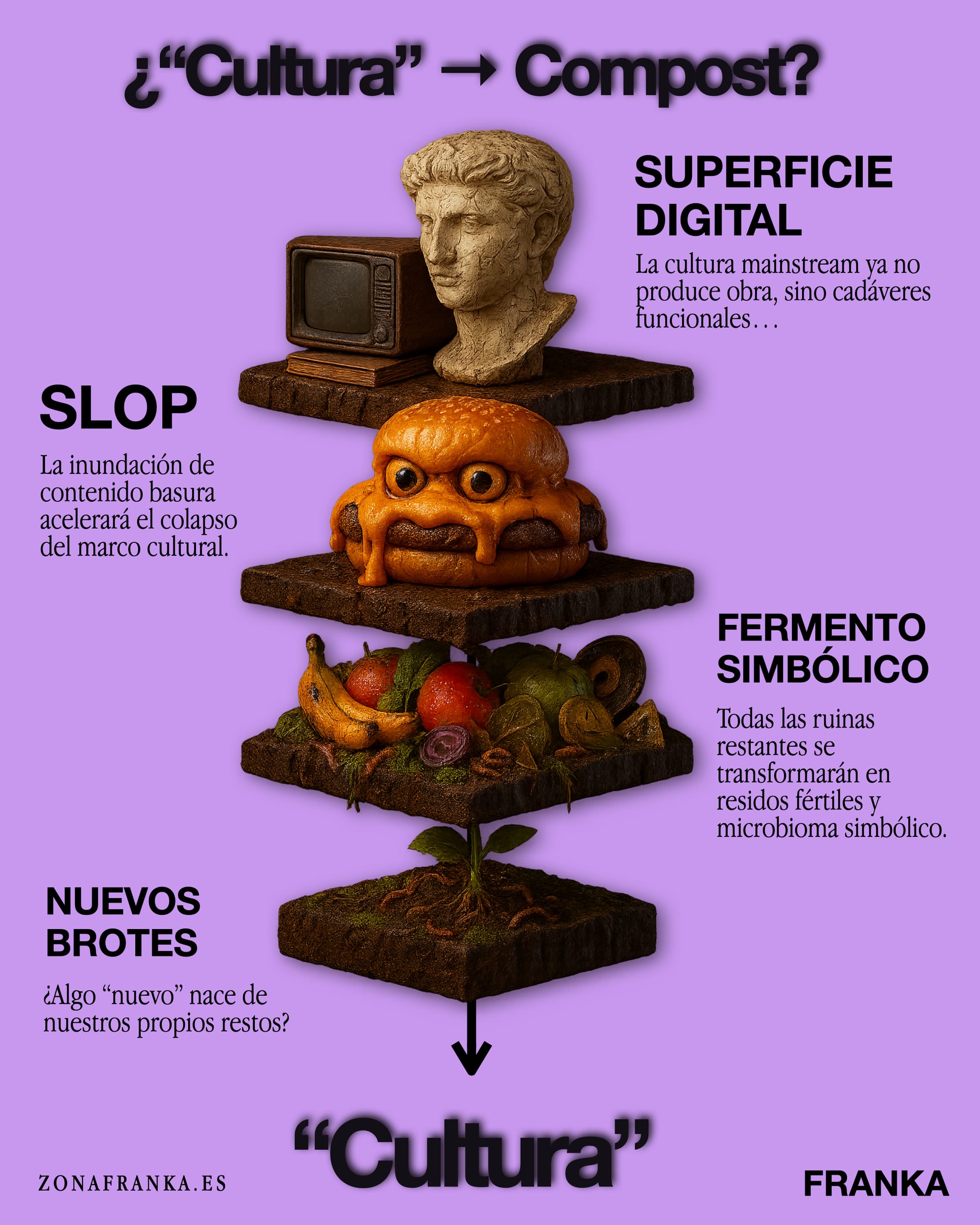 La idea de Cultura como Compost implica asumir el fracaso del modelo de la dialéctica lineal del progreso tecnológico. A partir de ahí no habrá una línea recta hacia el mañana, sino una espiral de residuos. Es decir, estamos viviendo un proceso de descomposición. Al igual que el compost, se trata de una mezcla de restos, SLOP, burnout digital, Brain rot content y ruinas simbólicas que, sin embargo, fertilizará futuros más lentos, más humanos y menos espectaculares.